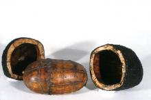 The sculpture of Dominique Morel has been increasingly concerned with protection. The Canadian artist's earlier works were skeletal pieces, which were stripped down, revealing the bamboo armatures of indeterminate beings. Morel's newest body of sculptures, though concerned with the same issues, has taken on a new density. The work has become even more corporeal by creating shells containing inner cores. These outer shells are built up from a range of materials that attempt ta provide security from the world outside- riveted aluminum, sisal, wood. Taking the poetry of Ranier Maria Rilke as inspiration, Morel's most recent work gives form to the excerpt; "Long ago we knew, or perhaps we only suspected as much, that we contained our death like a fruit its pit". Source : Communiqué de presse, Kay Garvey Gallery.